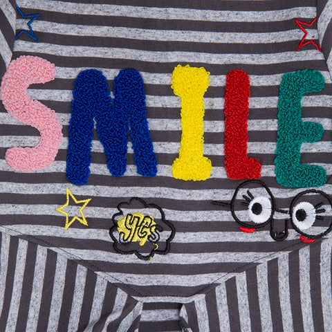 T-Shirt aus der Tuc Tuc Girl's Clothing Line mit Druckknöpfen auf der Rückseite, Streifenmuster und mehrfarbige Stickerei auf der Vorderseite.