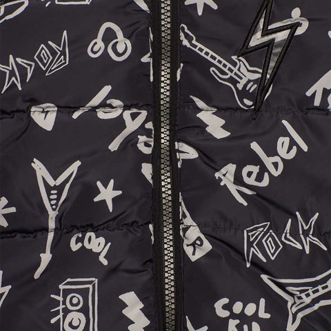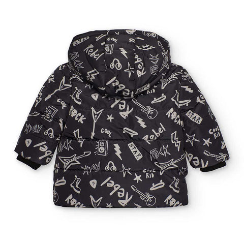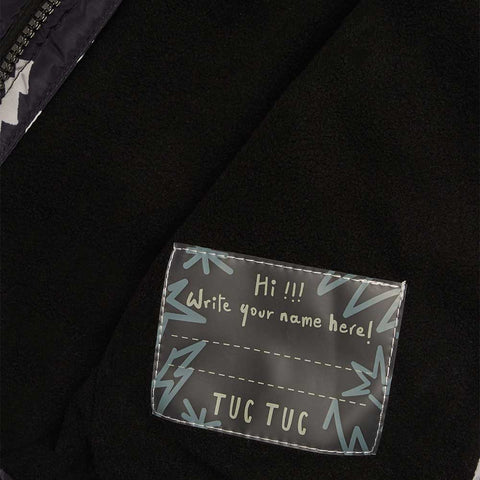 Giubbotto della Linea Abbigliamento Bambino Tuc Tuc, con microfanbtasia all over su fondo nero, con cappuccio e chiusura zip.