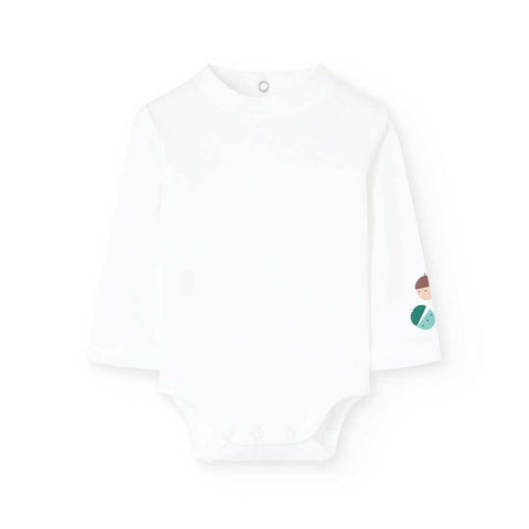 Latzhose aus der Kinderbekleidungslinie Boboli, aus Cord mit aufgestickten Eicheln auf der Vorderseite. Kombiniert mit einem einfarbigen T-Shirt.