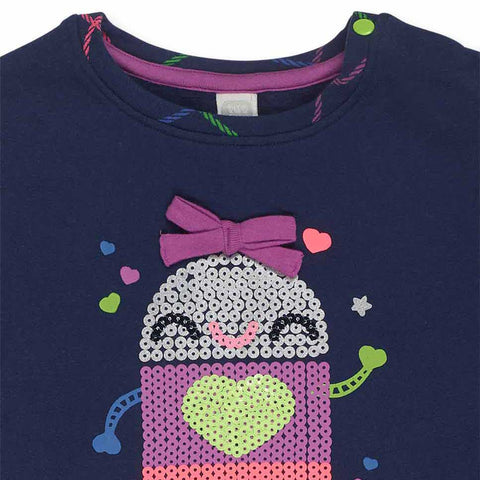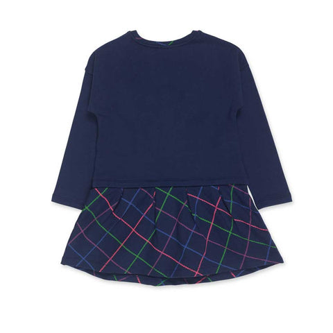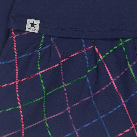 Kleidchen aus der Tuc Tuc Kinderbekleidungslinie, mit Paillettenapplikation auf der Vorderseite und Rock mit Karomuster in fluoreszierenden Farben.