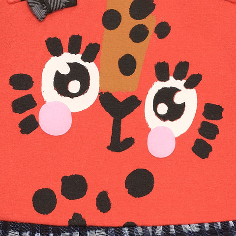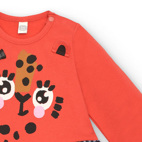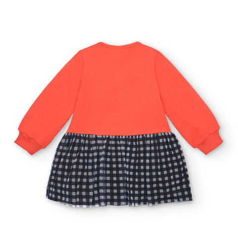Kleidchen aus der Tuc Tuc Kinderbekleidungslinie mit plüschigem Oberteil mit Knöpfen an der Schulter und kontrastfarbigem Druck. Der weite Rock hat an der Außenseite karierten Tüll.