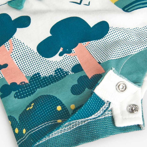 Ein Strampler aus der Boboli-Kinderbekleidungslinie mit Knöpfen am unteren Ende und einem durchgehenden farbigen Muster.