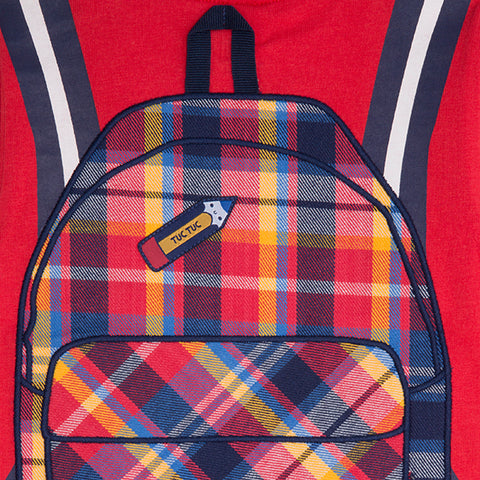 T-Shirt aus der Tuc Tuc Childrenswear Line mit Druckknöpfen auf der Schultergurt und auf der Rückseite schönes Design eines Rucksacks mit Stickerei.