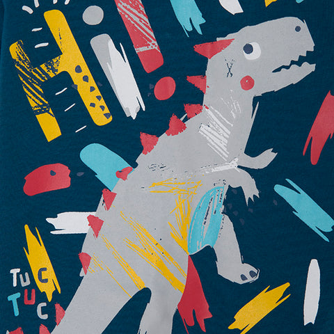 Zweiteiliger Anzug aus der Tuc Tuc Childrenswear Line bestehend aus Shorts mit elastischem Bund und Schnürsenkel und T-Shirt mit Knöpfen an der Schulter und Print Dinosaurier auf der Vorderseite.