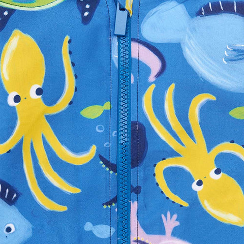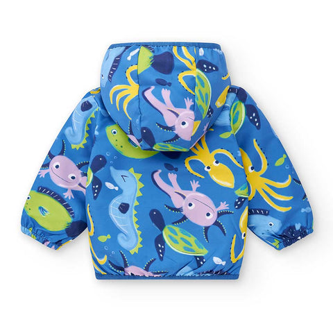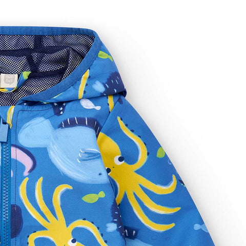 Windjacke aus der Kinderbekleidungslinie Tuc Tuc, mit Kapuze und Netzfutter innen. Marine-Allover-Muster.