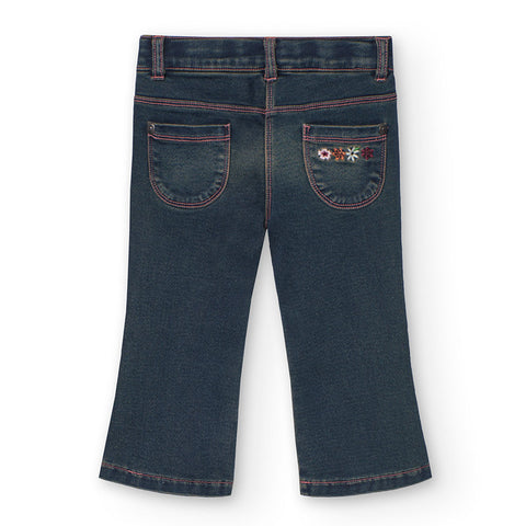 Denim-Hose aus der Kinderbekleidungslinie Boboli mit ausgestelltem Modell und aufgestickten Blumen an den Taschen.
