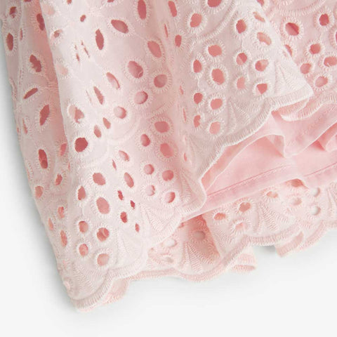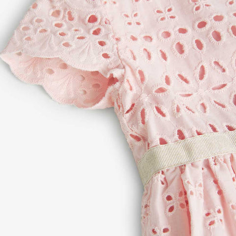 Elegantes Kleidchen aus der Kinderkollektion von Boboli, aus perforiertem Stoff, mit Knöpfen auf der Rückseite und Ripsband in der Taille.