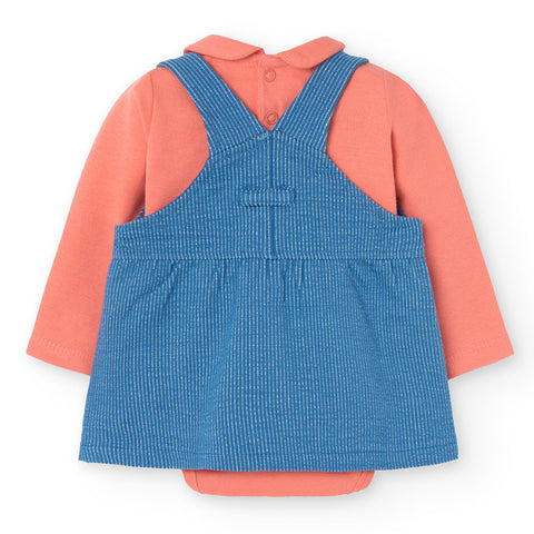 Zweiteiliges Outfit aus der Boboli Girls' Clothing Line, mit gestreiftem Latzrock mit Stickerei auf der Vorderseite, einfarbiges T-Shirt mit Rundkragen.