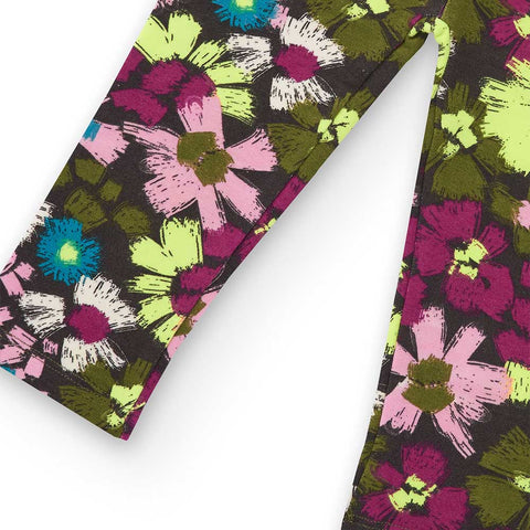 Tuta aus der Kinderbekleidungslinie Tuc Tuc, mit mehrfarbigen gemusterten Leggings und Sweatshirt mit Aufdruck auf der Vorderseite.