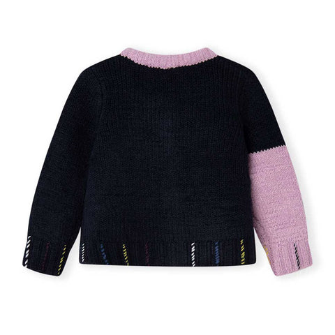 Strickjacke aus der Linie Ba Clothing, bina tuc Tuc, mit Lurexknöpfen und farbiger Stickerei auf der Vorderseite.