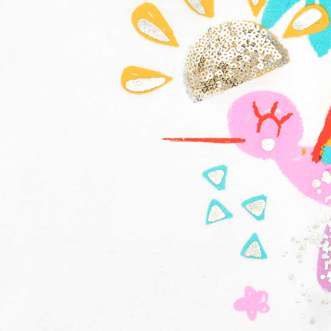 T-Shirt aus der Bekleidungslinie Tuc Tuc Bambina, mit buntem Druck auf der Vorderseite und Applikation von kleinen Pailletten.