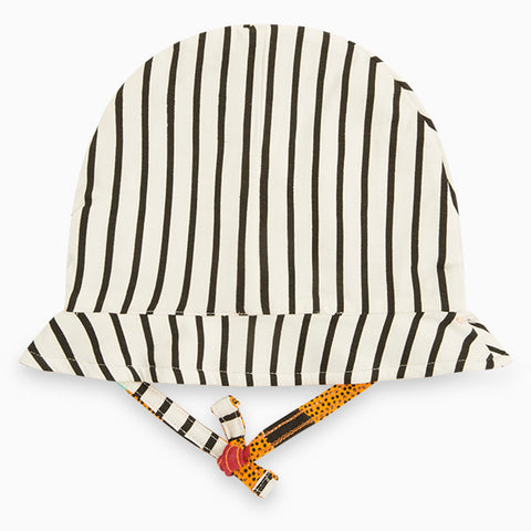 Mütze aus der Modelinie des Tuc Tuc-Mädchens mit Schnürsenkeln unter dem Kinn und Streifenmuster mit farbiger Applikation auf der Vorderseite.
