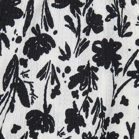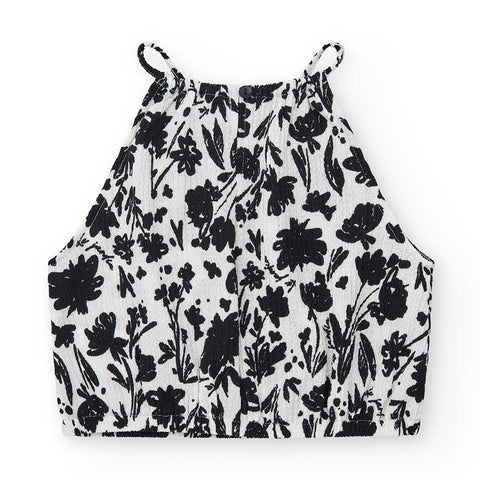 Kurzes Top der Bekleidungslinie Nath Kids mit kurzen Trägern und Rundhalsausschnitt. Schwarz-auf-weißes Blumenmuster.