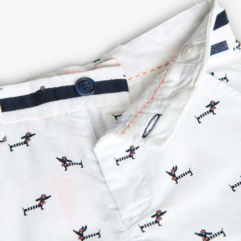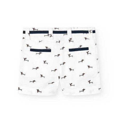 Short of the Children's Clothing Line Boboli, with a pattern of small dogs on a white background. Adjustable waist size and gros grain detail on the belt.