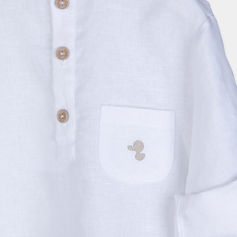 Long-sleeved linen shirt from the Lalalù Childrenswear Line, with mandarin collar and wooden buttons.