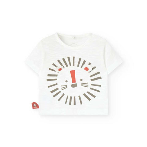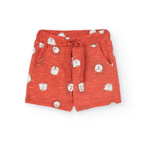 Complete two-piece set from the Children's Clothing Line Boboli, with a slub cotton t-shirt and snap buttons on the shoulder strap, patterned shorts with pockets and drawstring at the waist.
