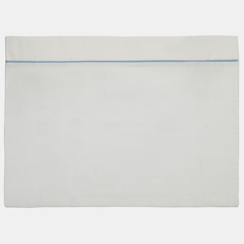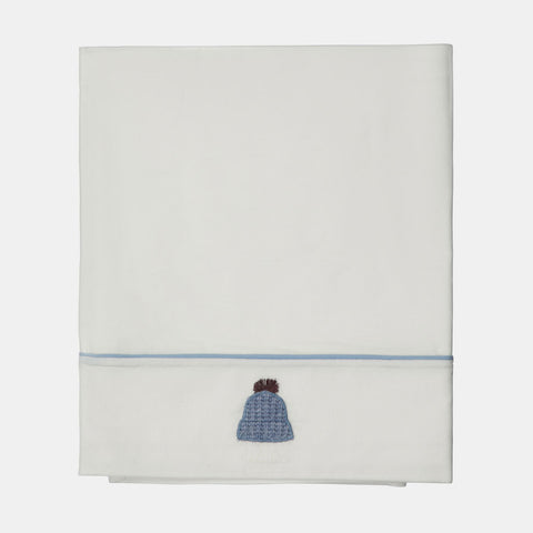 Sheet for pram, from the Lalalù Baby Line, with light blue piping and application of a knitted hat.