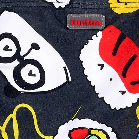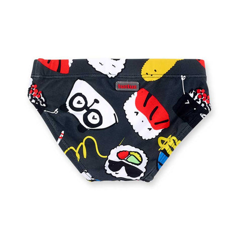 Swim briefs from the Tuc Tuc Kids Clothing Line, featuring an all-over sushi pattern.