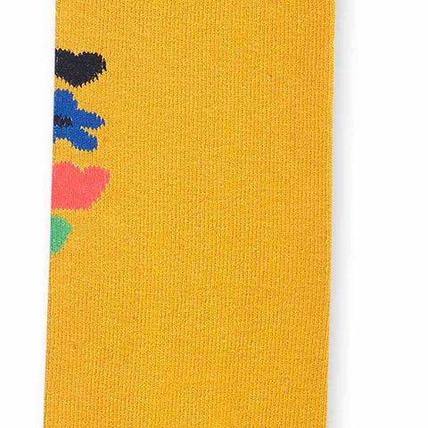 Wool tights from the Bmabina Tuc Tuc clothing line, with floral pattern on a yellow background.