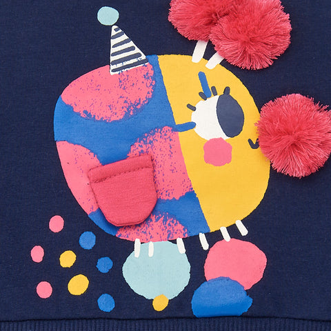 Little dress from the Tuc Tuc Girl's Clothing Line, made of plush with a wide patterned skirt in neon colors. The plain-colored top has multicolor designs and appliqués on the front.