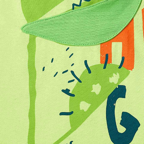 Short-sleeve T-shirt from the Tuc Tuc Children's Clothing Line, featuring snap buttons on the shoulder and fabric appliqués on the front.