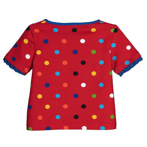 T-shirt from the Rosalita Senoritas girl's clothing line, with design on the front and colorful polka dot pattern on the back. Short mannequins with riccetto application on the edge.