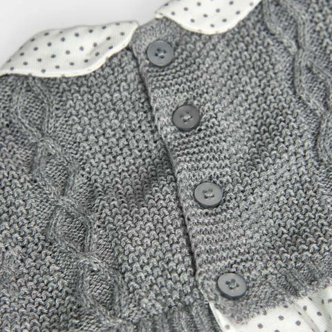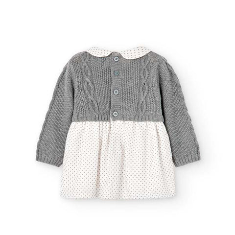 Dress from the Boboli Girls' Clothing Line, with knitted top, and skirt and collar in light fabric with gray polka dots on an ivory background.