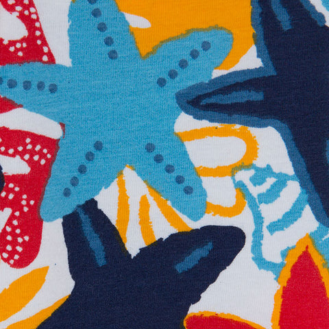 Pirate leggings from the Babina Tuc Tuc Clothing Line, Red Submarine collection, with all-over pattern of colored starfish.