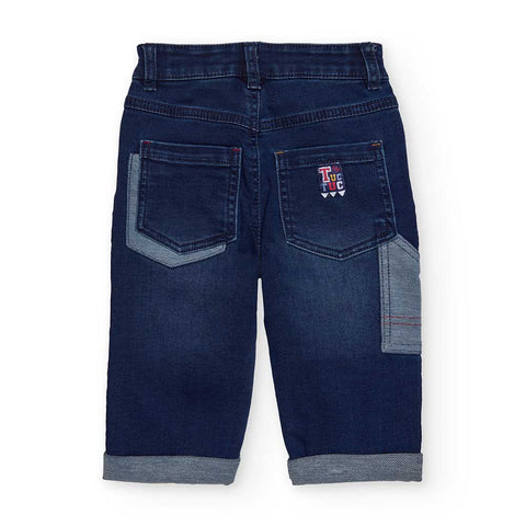 Denim pants from the Children's Clothing Line Tuc Tuc, with a contrasting fabric insert and adjustable waist size.