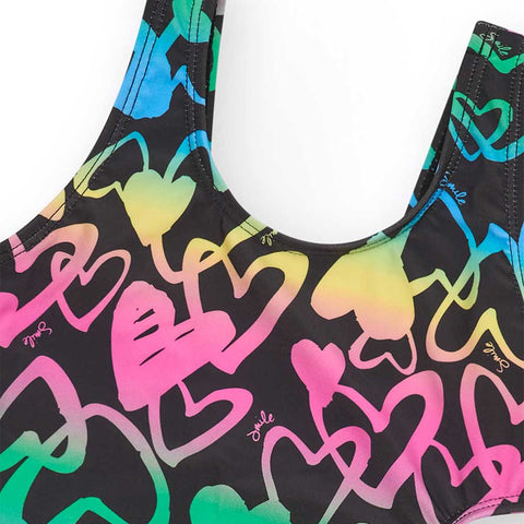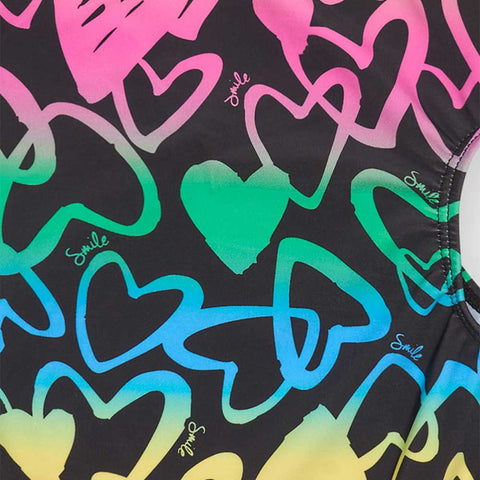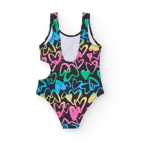 One-piece swimsuit from the Nath Kids Girls' Clothing Line, featuring an asymmetrical cut-out design on one side and a tropical pattern.