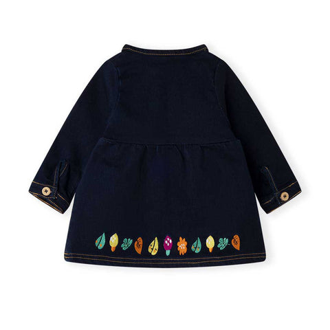 Denim dress from the Tuc Tuc Girl's Clothing Line, with colored embroidery on the bottom and a riccetto on the front with wooden buttons.