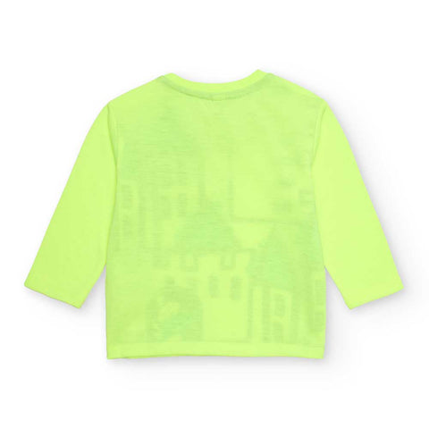 T-shirt from the Tuc tuc Children's Clothing Line, with a colorful print on the front on a fluorescent background.