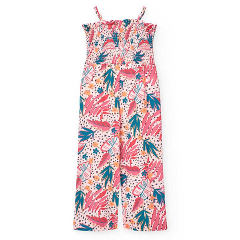Tuta lunga della Linea Abbigliamento Bambina Boboli, in tessuto crepe, con fantasia tropicale e parte superiore elasticizzata.