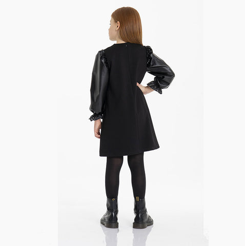 Abitino della linea abbigliamento bambina fracomina Mini, con manichine in ecopelle, traforata sui polsini. Chiusura zip sul dietro