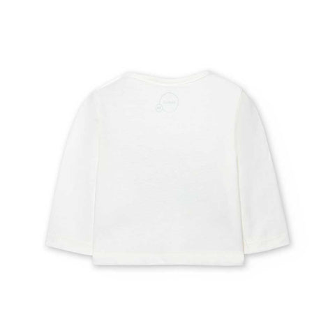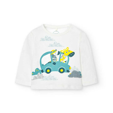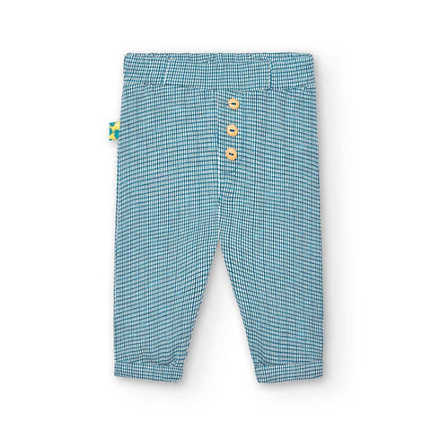 Completo due pezzi della Linea Abbigliamento Bambino Boboli, con pantalone a cavallo basso e fantasia a quadrucci; maglietta a manica lunga con bottoncini a pressione sulla spalla e stampa colorata sul davanti.