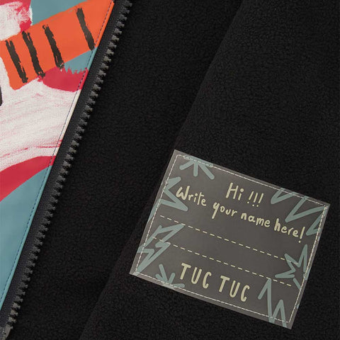 Cerata della Linea Abbigliamento Bambino Tuc Tuc, con cappuccio con cresta e disegno multicolor di pinguino chitarrista. All'interno Pile.