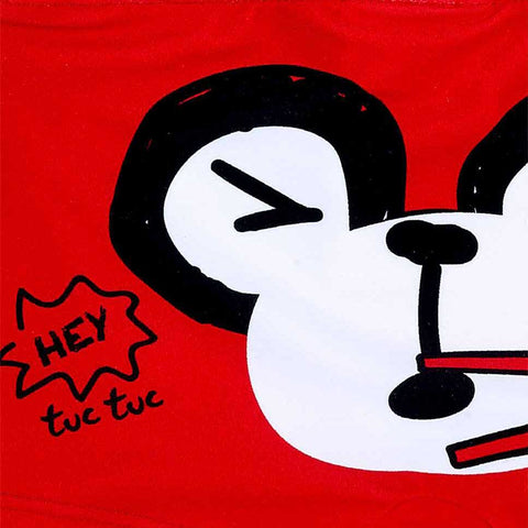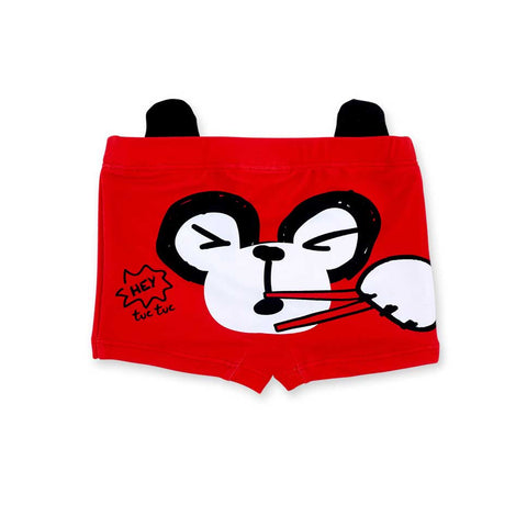 Costume boxer aderente della Linea Abbigliamento bambino Tuc Tuc con stampa colorata sul davanti e piccole orecchie in tessuto applicate sul dietro.