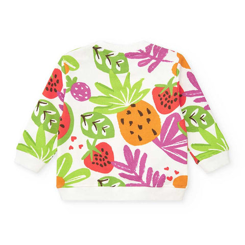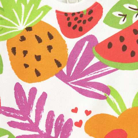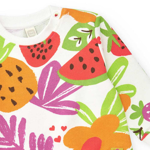 Felpa della Linea Abbigliamento Bambina Tuc Tuc, con bottoncini a pressione sulla spallina e fantasia tropicale su fondo bianco.