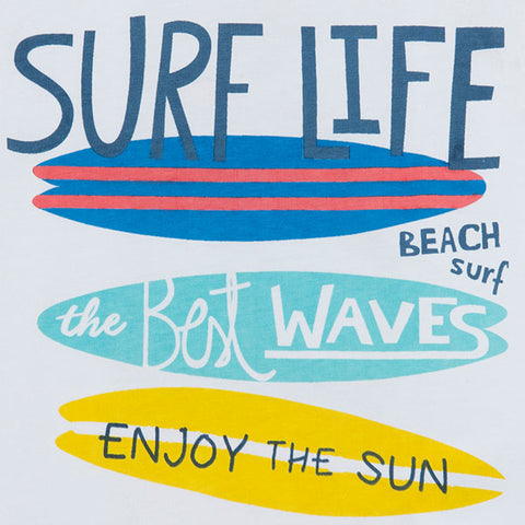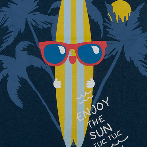 Completo tre pezzi della Linea Abbigliamento Bambino tuc Tuc, collezione Enjoy the Sun, composto di pantaloncino a tinta unita, e due magliette con stampe colorate sul davanti.