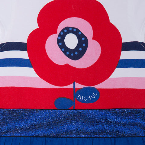 Abito della linea abbigliamento bambina Tuc Tuc, con elastico glitter in vita, ampia gonna e stampa colorata sul davanti.