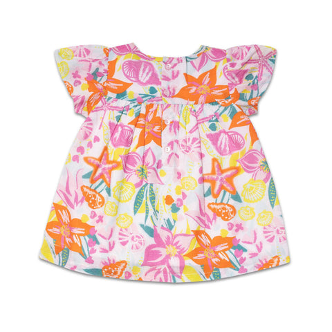 Abitino della Linea Abbigliamento Bambina Tuc Tuc, modello largo tagliato sul torace. Fantasia con soggetto marino in colori fluo.