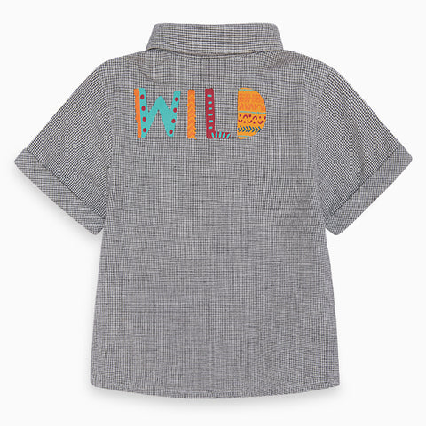 Camicia della linea abbigliamento bambino Tuc Tuc, a mezza manica con fantasia a piccoli quadretti con stampa colorata sul fondo.