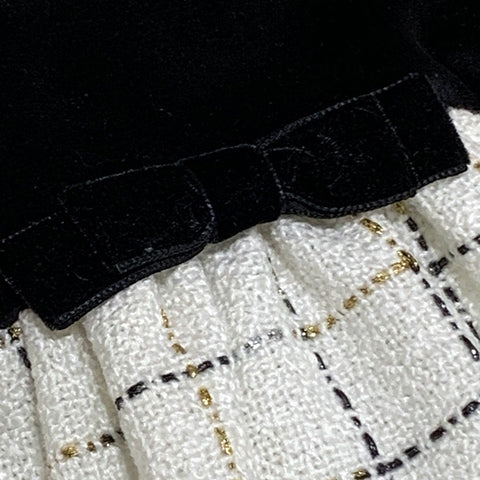 Corpetto in velluto ed ampia gonna in tessuto morbito con pattern chanel.