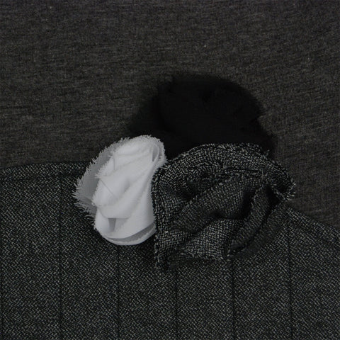 Abito a collo alto della linea abbigliamento bambina Miritllo. Scollo con fiori applicati in tessuto e plissettatura. Fondo con balze in diverso colore.