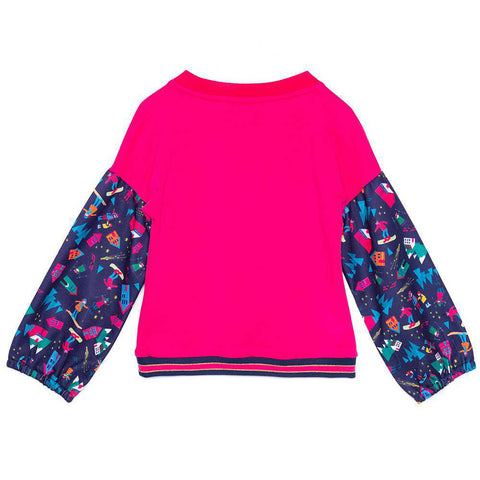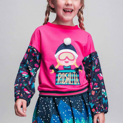 Felpa girocollo della Linea Abbigliamento Rosalita Senoritas con maniche lunghe. Parte centrale in rosa con motivo Rosalita sul davanti e maniche con stampa a tema sci.
