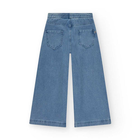 Pantalone jeans della Linea Abbigliamento Bambina Nath Kids, a zampa con misura regolabile in vita. Denim molto elasticizzato.
