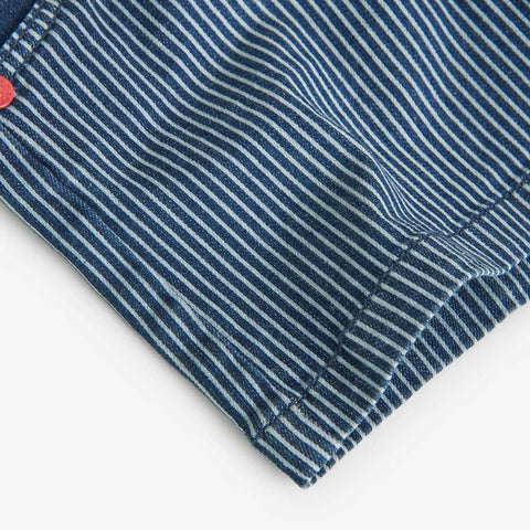 Pantaloncino della Linea Abbigliamento Bambina Boboli, in denim a righine e con finiture rosse. Misura regolabile in vita.