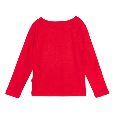 Rundhals-T-Shirt aus der Rosalita Senoritas Girl's Clothing Line mit Ärmeln lange. Rote Farbe mit Wintermotivdruck auf der Vorderseite. Mehrfarbiges Pompon-Detail auf den Armen.