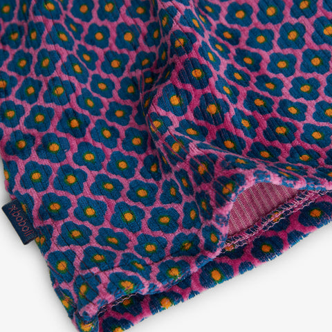 Ein Kleid aus der Kinderkollektion von Boboli, aus Mikro-Satin-Samt mit Hemdkragen und kleinem Blumenmuster.