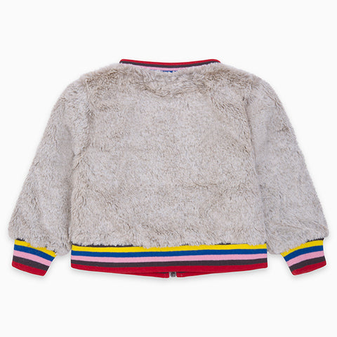 Jacke aus der Tuc Tuc Girl's Clothing Line aus Kunstpelz geschlossen Vorderseite mit Reißverschluss und gestreiftem Gummiband an den Verzierungen.